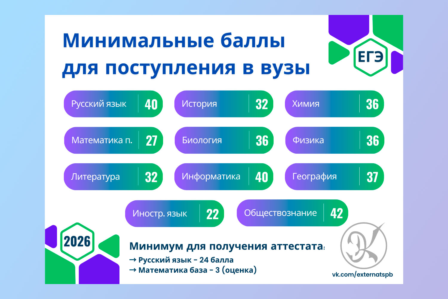 Для получения аттестата выпускникам школ нужно набрать минимум 24 балла по русскому языку и сдать экзамен по базовой математике. Для последующего поступления в вуз требуется набрать 36 баллов по русск...